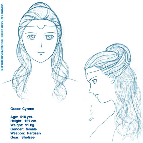 Cyrene Design #3 Media: pencil, Photoshop This is the final design for Queen Cyrene of the Deus Ex Machina IF. She was my first and favorite character, and rather difficult to come up with a good visual for. At first I tried to make her look too much like Zephyr, but I think this captures both her apparent youth and the sort of sad delicacy that I wanted to convey with her character. For once, the design is almost exactly as I envisioned it. That URL on the side really needs to be changed. ^^ |