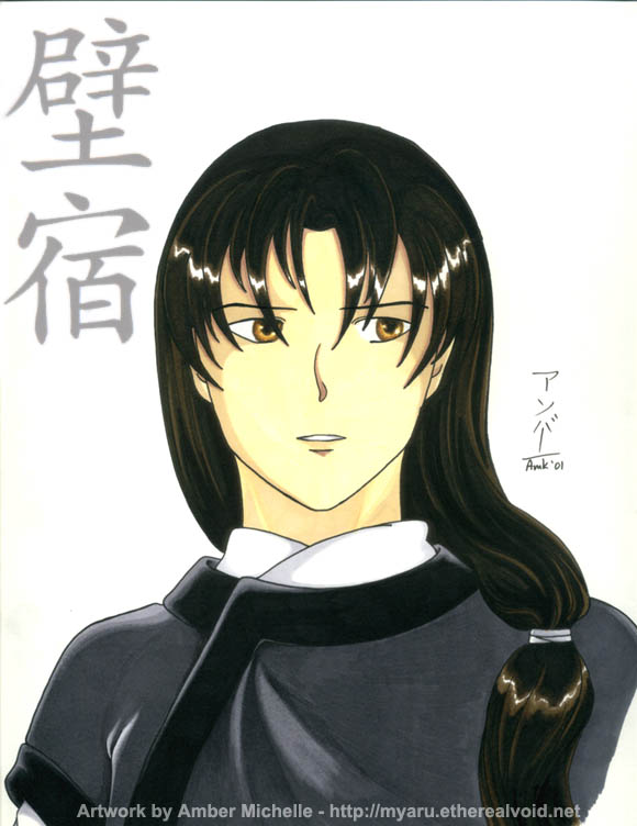 Genbu Seishi Namame Media: pencil, Micron liner, marker, Photoshop This was my creation for Fushigi Soudan 2, which is now closed. The image has absolutely no relation to whatever Yuu Watase is going to come up with for her new story about Genbu no Miko. It's my second try at creating an image for him, and I think it's satisfactory. The kanji in the top left corner is his seishi name, ripped conveniently from Kanji & Kana and edited on in Photoshop for my amusement. Since this isn't the type of drawing that needs a background, it's all I could come up with to fill the empty space. |