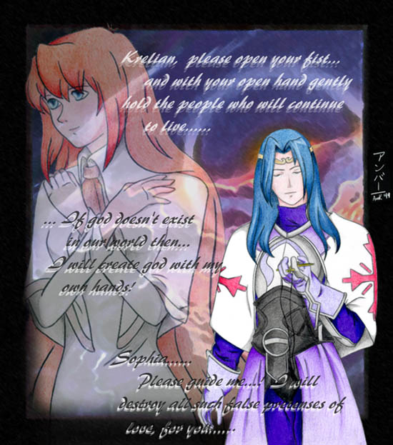 Shattered Dream Media: Prismacolor pencils, Photoshop The background is from a system card in the Star of the Guardians game, heavily modified in Photoshop. Placement of the halo behind Krelian's head was unintentional and oddly appropriate. All of the quotes are from the Episode IV flashbacks about Sophia's death. It's my favorite part of the story - the most touching, in my opinion. And since Krelian became my favorite character over time, I couldn't leave this scene untouched. Criticisms: Though I worked hard to draw the hands right on both images, Krelian's ended up too small and Sophia's aren't quite right - but they're balanced. Most people don't like her expression, for some reason. The text still looks pasted on, but I was a little better about the shading this time. |